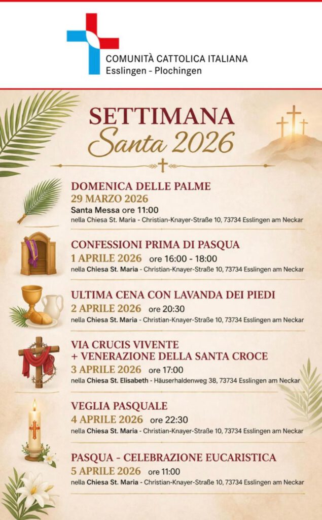 | Gio. 28 | 20.30 | Giov. Santo, Cel. Ultima Cena + Lavanda i piedi | St. Elisabeth, Esslingen |